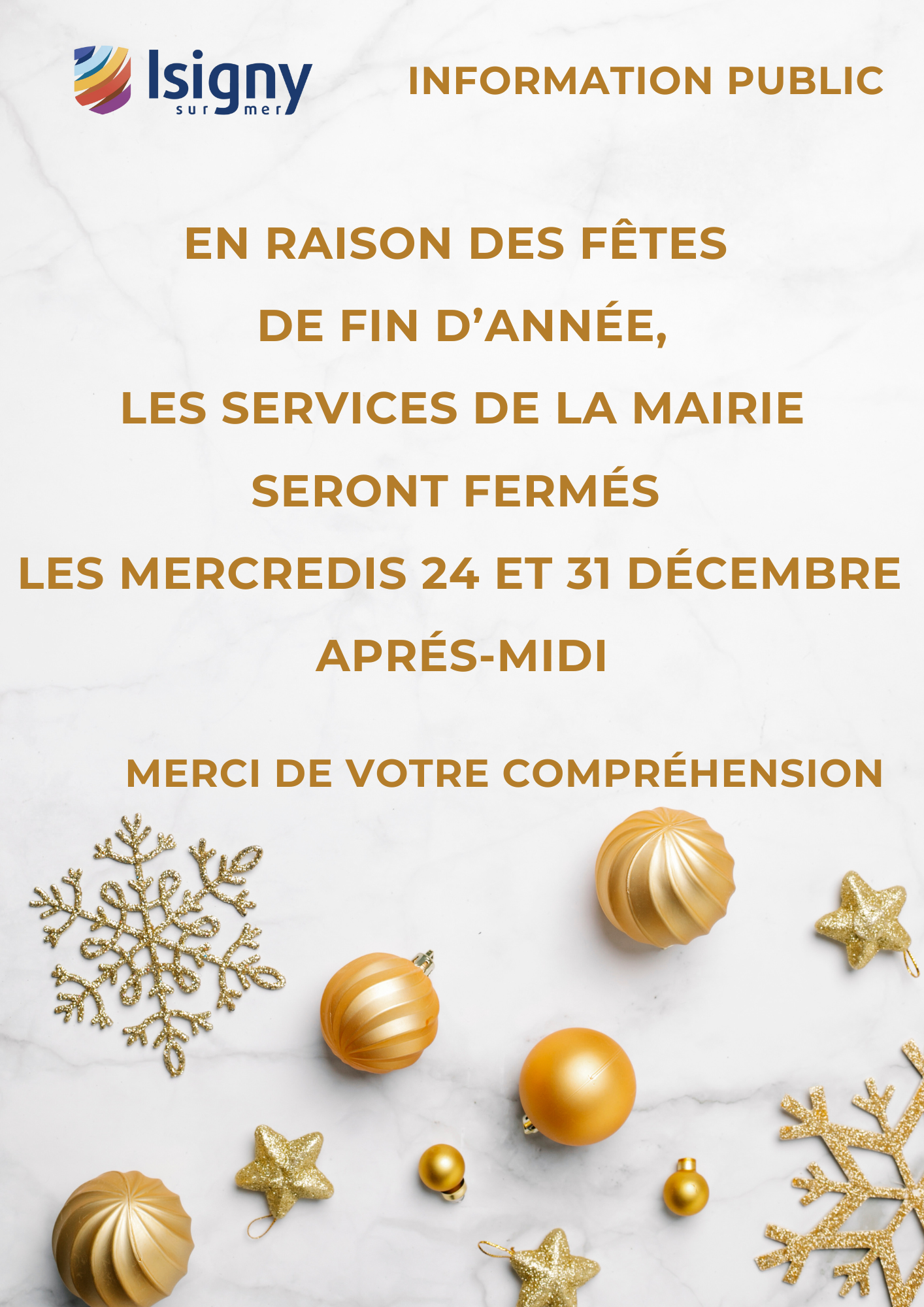 En raison des fêtes de fin d'année, les services de la mairie seront fermés les mercredis 24 et 31 décembre 2025.